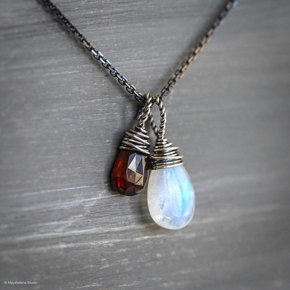 Blood Moon Rainbow Moonstone Red Garnet Sterling Silver Charm Necklace