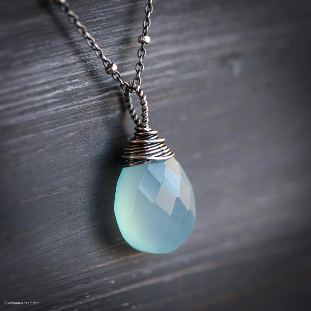 Sacred Light – Aqua Blue Chalcedony Briolette Wire Wrapped Sterling Silver Necklace