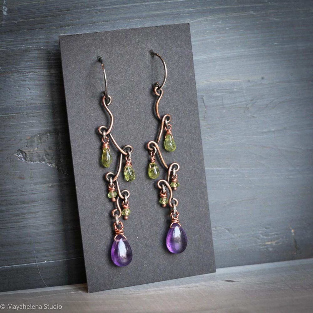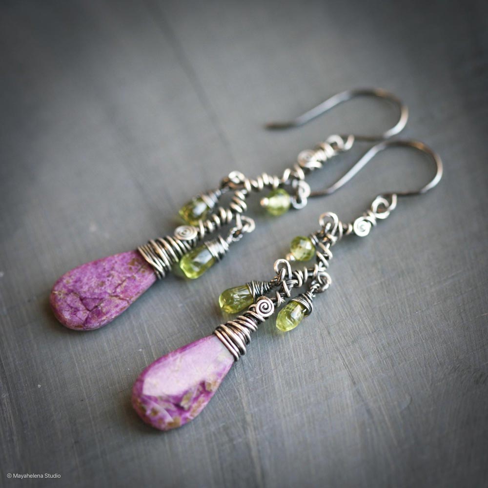 Exotica – Purple Stichtite Slices and Peridot Free Form Wire Sculpted Sterling Dangle Silver Earrings