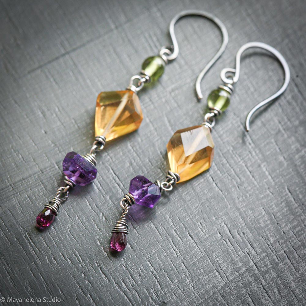 Crystal Medley – Peridot Citrine Amethyst Garnet Sterling Silver Earrings