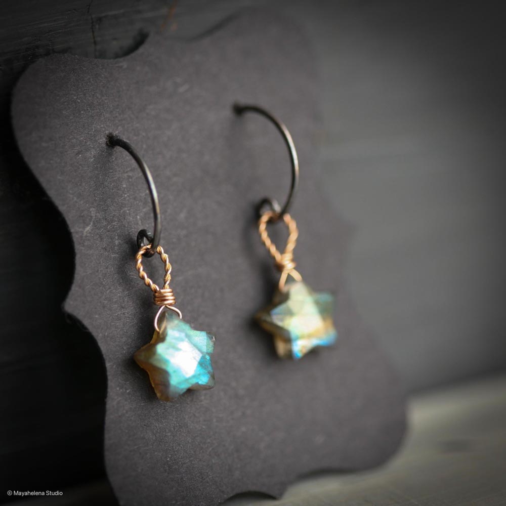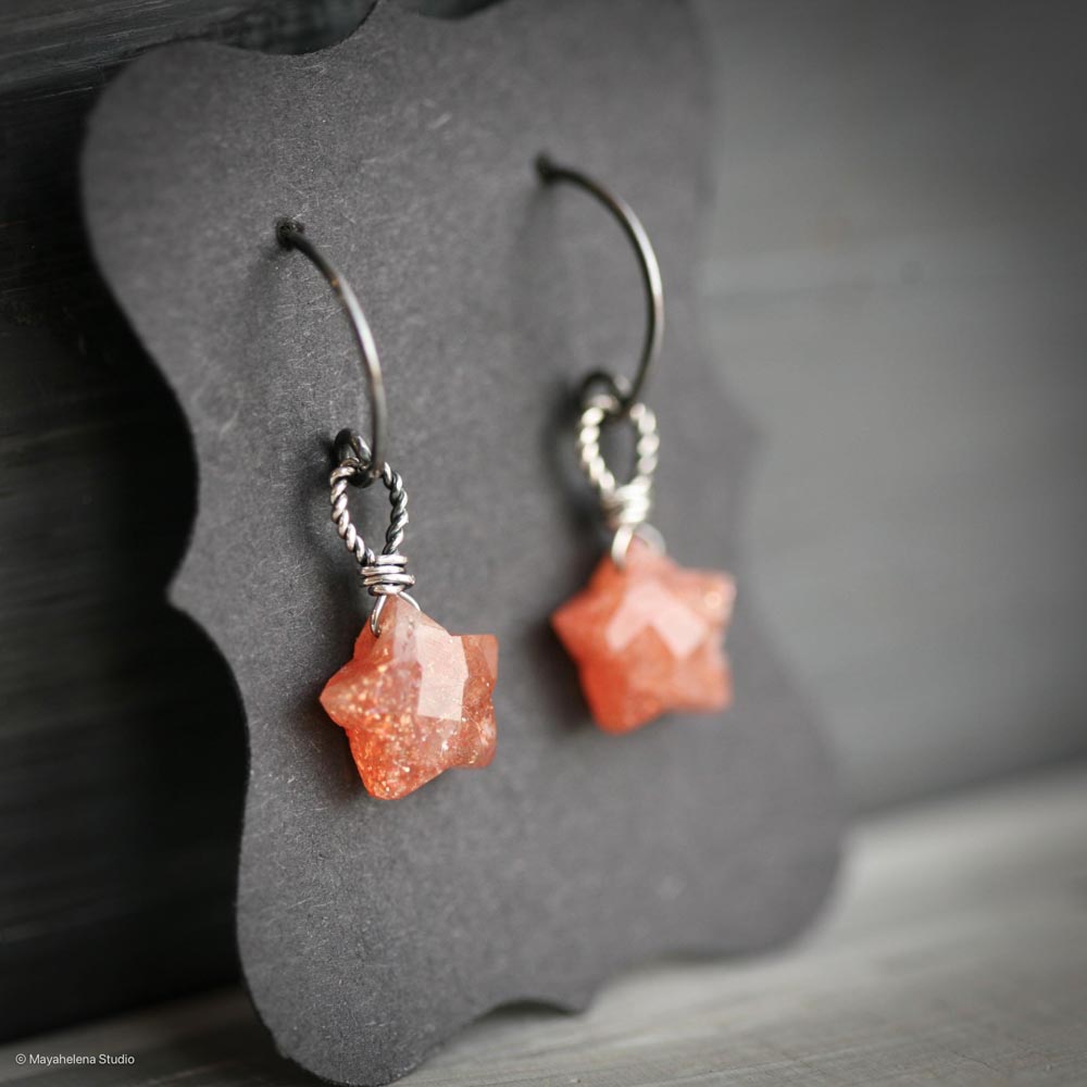 Solar Eclipse – Sunstone Moonstone Paisley with Accent Brass Hearts Oxidized Sterling Silver Earrings