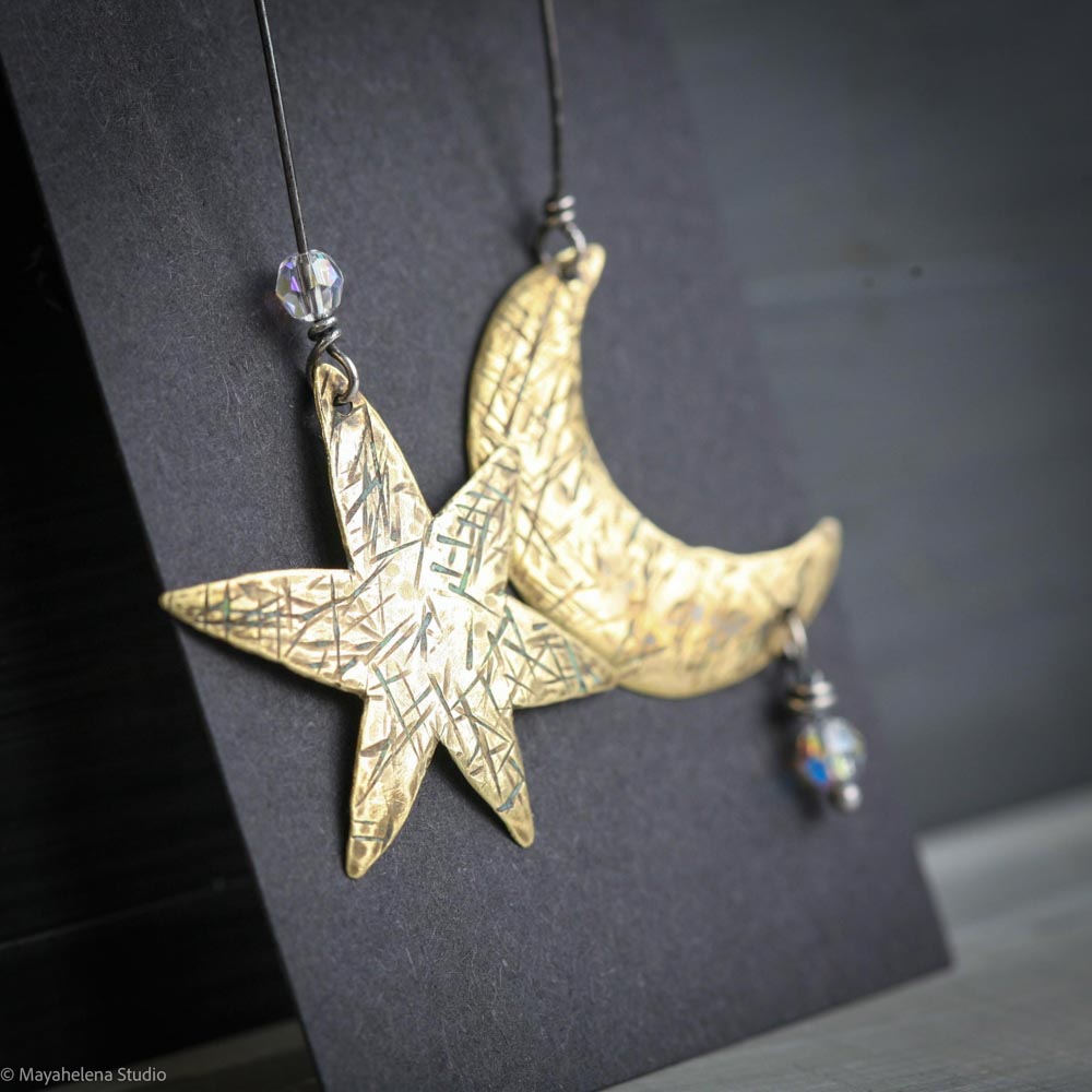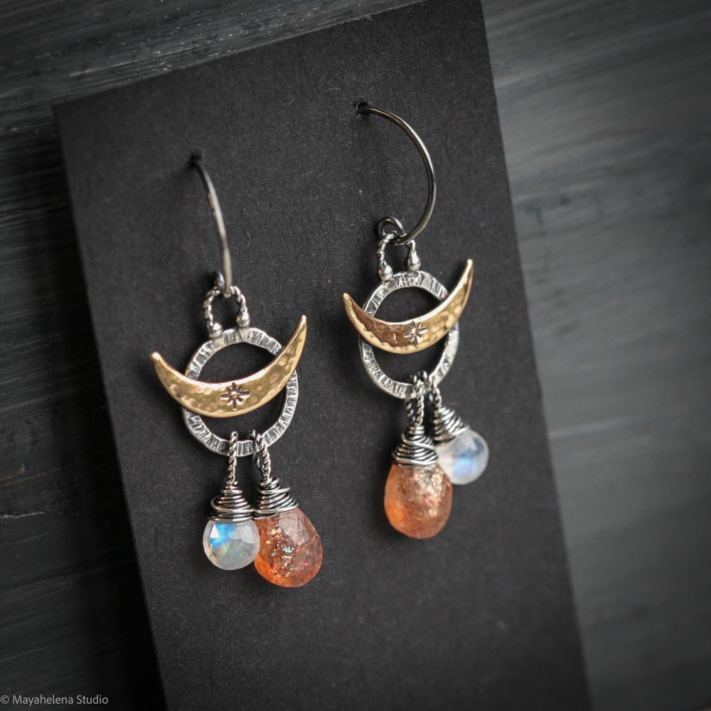 Solar Eclipse – Sunstone Moonstone Accent Brass Moon Oxidized Sterling Silver Earrings