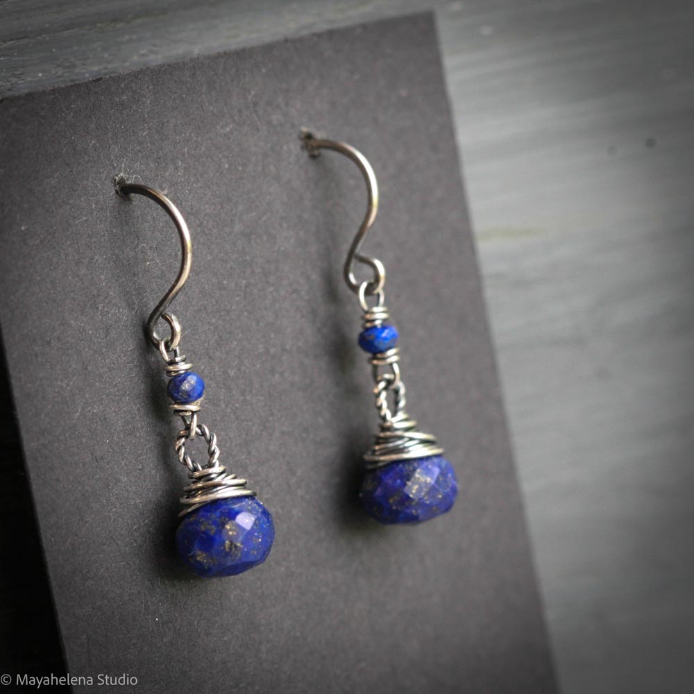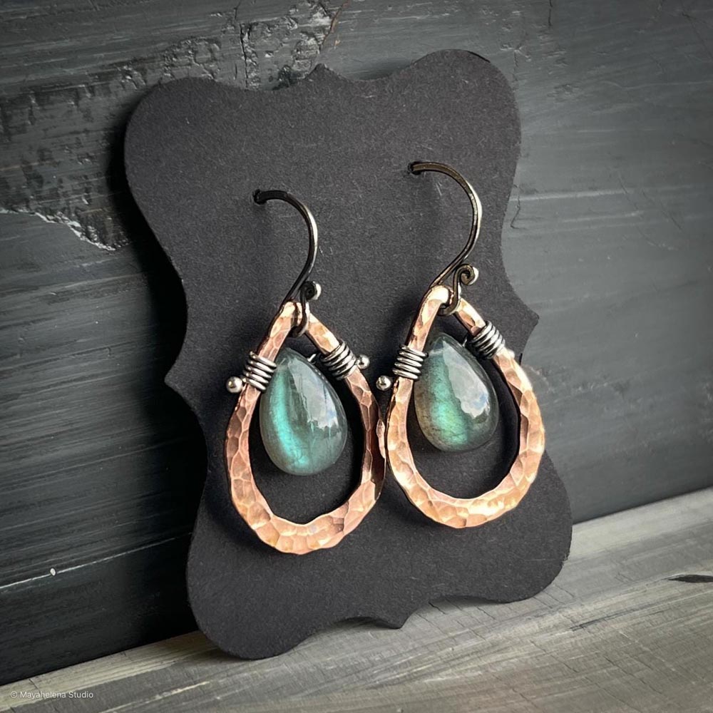 Simple smooth labradorite briolettes wire wrapped in sterling silver. They come with hand forged ear wires. Oxidized and hand polished.